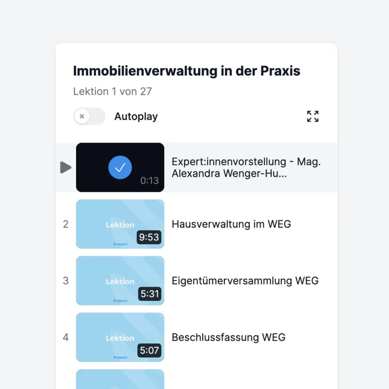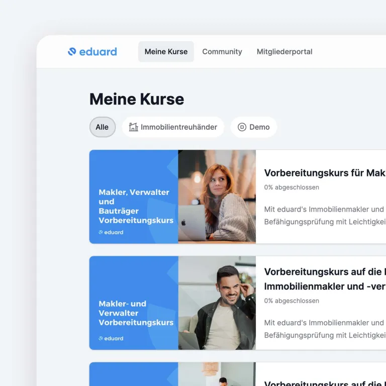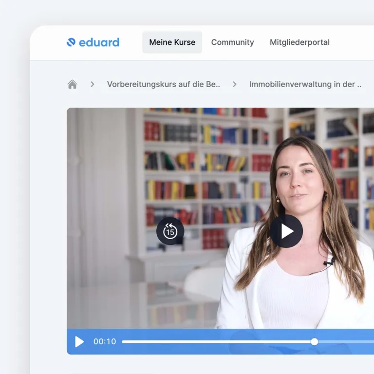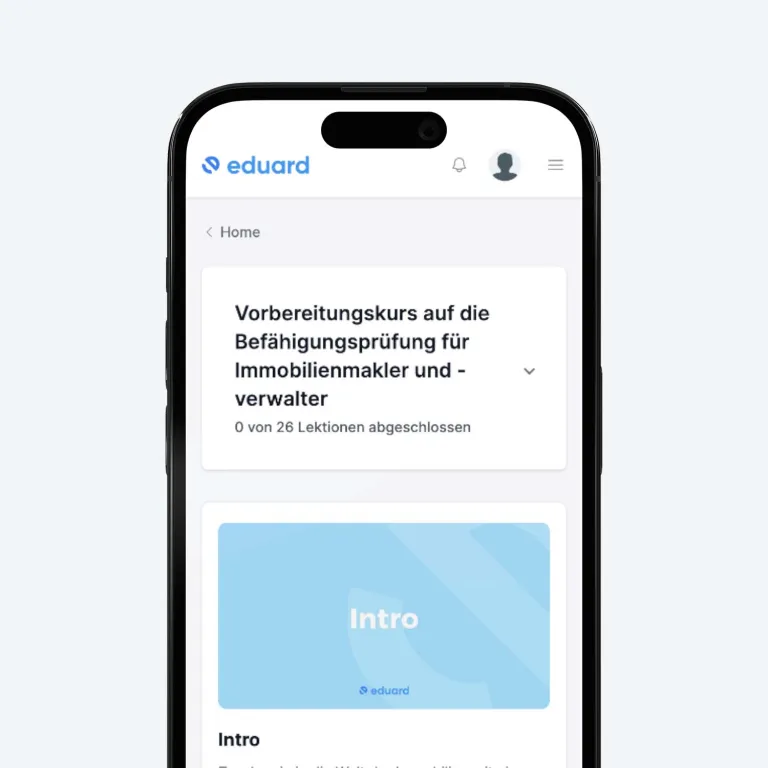 eduard hebt das Lernen auf das nächste Level! Unsere interaktiven, digitalen Kurse kombinieren abwechslungsreiche Lernformate mit sofortigem Feedback, das Dich motiviert und Deinen Lernerfolg beschleunigt. Erlebe On-Demand-Kurse, die sich Deinem Alltag anpassen und Dich optimal auf Deine Karriere in der Immobilienwirtschaft vorbereiten.